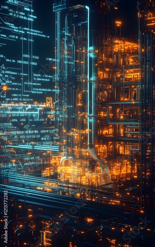A nuclear-powered oil extraction site, with digital stock data showcasing the growth of investments in nuclear and oil energy