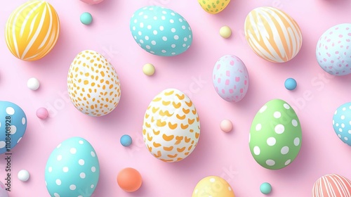A pastel-colored Easter egg pattern with playful polka dots and stripes, Pastel Easter eggs pattern, decorative colorful Easter eggs on pink background, festive holiday spring design