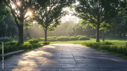 A paved path through a lush green park with sunbeams shining through the trees. The path leads to a meadow in the distance.