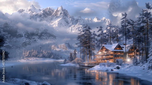 A peaceful snowfall over a mountain lodge
