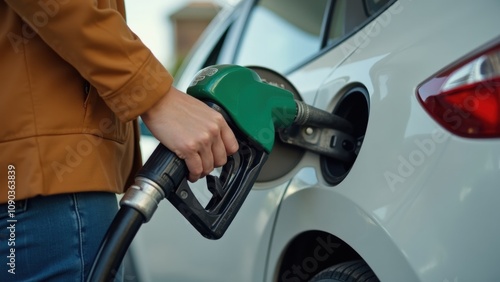 A person is fueling a white vehicle at a gas station in a suburban neighborhood during the day. The focus is on the fuel nozzle and the car's fuel tank