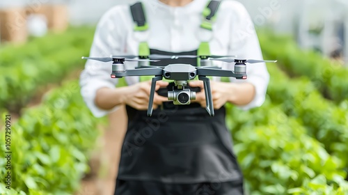 A person is holding a drone over a field of plants.
