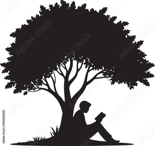 A person reading a book under the shade of a large tree silhouette vector