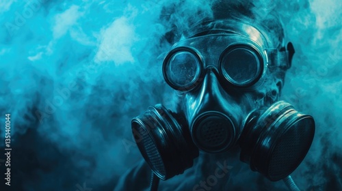 A person wears a gas mask amidst smoky haze, potentially indicating a hazardous environment