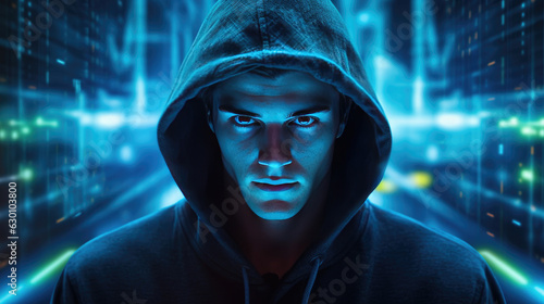 A photo showcases a hacker in a hoodie attempting to breach a digital barrier