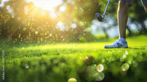A photograph of a professional golfer, in mid-swing, viewed in close-up