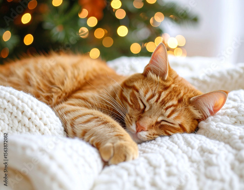 A photorealistic image of a cute orange tabby cat sleeping on a soft white blanket, natural lighting, close-up, high detail fur texture, cozy home setting