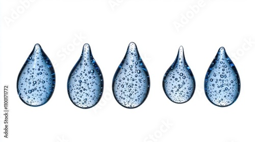 A photostock of crystal-clear water droplets in various sizes, isolated on a plain white background, perfect for hydration or purity-related concepts. High Quality