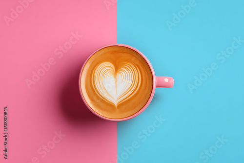 A pink coffee cup with heart latte art on a pink and blue background