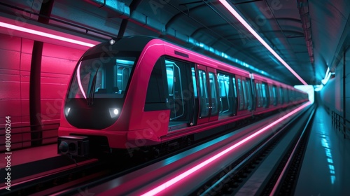 A pink train travels through a busy subway station
