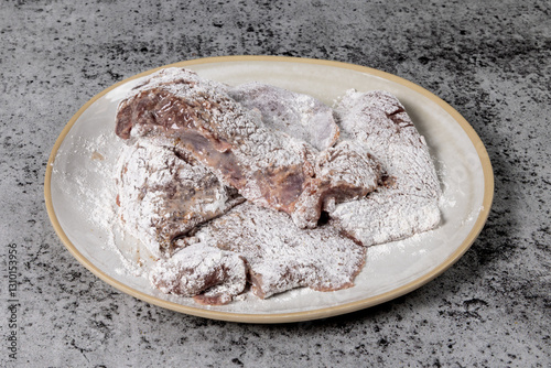 A plate full of raw uncooked pork or beef liver covered with flour ready for frying