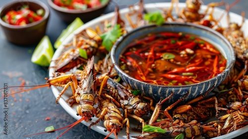 A plate of crispy fried insects served with dipping sauce, exotic cuisine theme, top view, adventurous eating, advanced tone, vivid colors