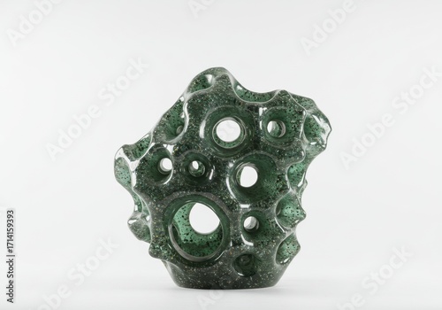 A porous green glass sculpture with a rock-like form and a multitude of smooth, circular holes of varying sizes.