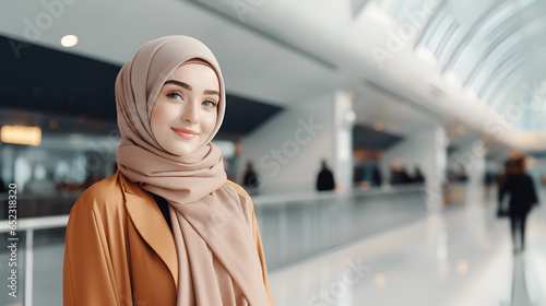 A portrait of a young Muslim student wearing a light hijab, looking at the camera and smiling, stands against the backdrop of the airport terminal.
