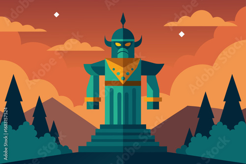 a powerful and ancient guardian statue overlooking