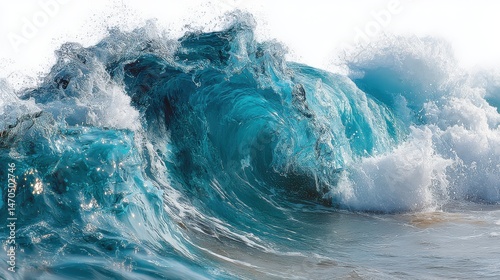 A powerful blue ocean wave crashing and splashing, isolated on a white background