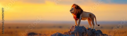 A powerful lion standing on a rocky hill, captured in the golden hour light, with the vast savannah in the background, showcasing the beauty of wildlife in its natural habitat