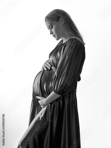A pregnant girl with blonde hair in a long dress poses in front of the camera on a light background. The concept of a happy pregnancy. Black and white photo.