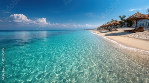 A pristine beach with golden sand, clear blue water, and umbrellas, perfect for a relaxing summer day.