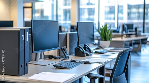 A professional office environment with individual workstations, each featuring a computer, phone, and organized paperwor