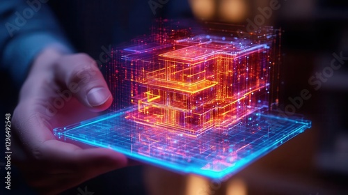 A real estate agent showcasing a futuristic apartment with glowing holographic smart home features and neon-lit interiors, Technology, 3D Render, Clean and modern