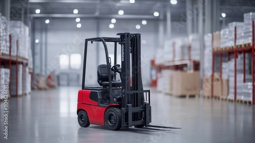 A red forklift positioned in a warehouse with stacked goods.