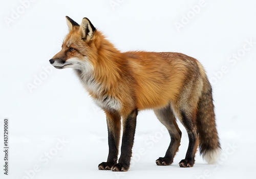 A red fox standing in a snowy field with a white background looking to the left side of the picture