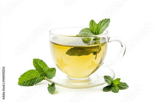 A refreshing cup of green tea with fresh mint leaves, elegantly placed on a transparent saucer, showcasing a serene and inviting atmosphere perfect for relaxation and wellness