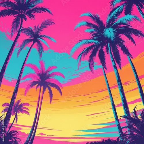 A retro 80s-inspired sunset with vibrant hues of pink, orange, and turquoise, set against a gradient background, evoking a synthwave aesthetic.