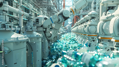 A robot arm is picking up plastic bottles in an industrial factory. with other machines and robots that work in different recycling stages