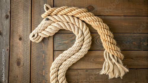 A rope is skillfully laid on a wooden background, forming an elegant silhouette of a horse. This scene combines marine aesthetics with the grace of equestrian art.