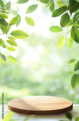 A round wooden podium on a green nature background with blurred leaves, for product presentation in the forest.