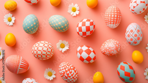 A row of colorful pastel Easter eggs, each uniquely painted with different texture on a yellow background