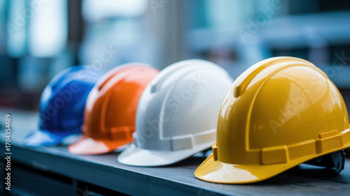 A row of four colorful hard hats, including yellow, white, orange, and blue, lined up on a dark surface, suggesting safety and construction.