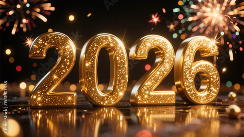 A scene featuring the year 2026 in bold, golden 3D letters with a sparkling, reflective surface. Happy New Year, Happy New Year 2026, Merry Christmas And Happy New Year