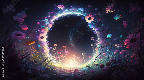 a scifi illustration of a warp portal in space, field of flowers, generative ai technology