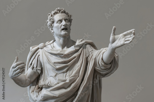 A sculpture of a Roman senator in oration, authoritative and expressive, set against a governance grey pastel background, representing leadership and rhetoric