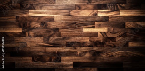 A seamless walnut wood texture close-up, with a saw blade and hammer lying on the wooden surface, surrounded by a large pile of wood and a smaller stack