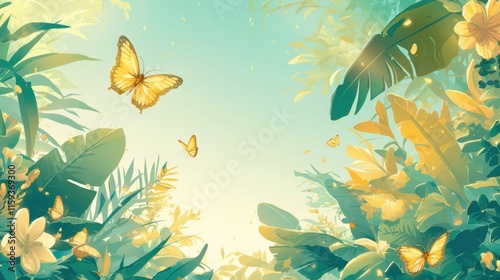 A serene jungle scene with butterflies and lush foliage.