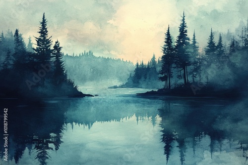 A serene lake scene with lush green trees and calm water