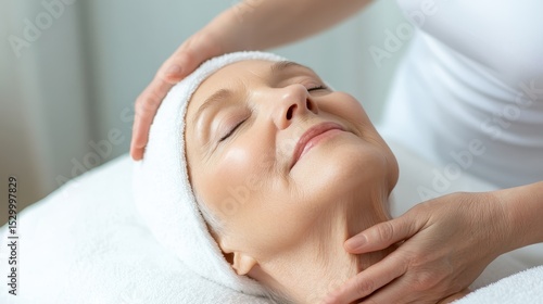 A serene moment captured during a spa treatment, showcasing a relaxed woman enjoying facial therapy, symbolizing wellness and self-care in a tranquil environment.