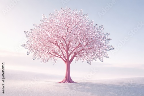A serene pink tree with crystal leaves standing alone in a snowy landscape under a soft blue sky
