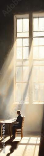 A serene scene featuring a person sitting alone at a table, illuminated by soft sunlight streaming through large windows.