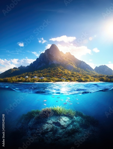 A serene underwater scene showcasing vibrant coral reefs beneath a clear blue sky with majestic mountains in the background.