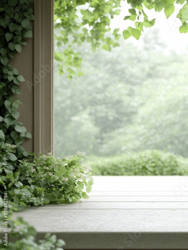 A serene view of lush greenery through an open window framed by cascading vines