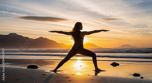 A serene woman practicing yoga on a peaceful beach at sunset with mountains in the background
