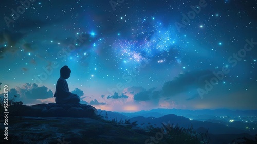 A silhouette of a meditating Buddha statue against a backdrop of a starry night sky. Constellations form the shape of a lotus flower