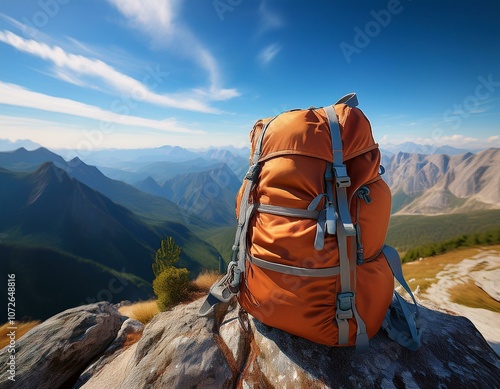 A single backpack on a rocky outcrop, with vast mountains and a deep blue sky in the background