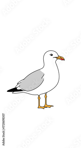 A single seagull stands alertly on its yellow feet with a sharp beak ready to feed.