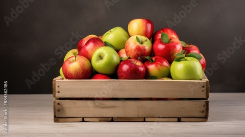 A single wooden crate filled with assorted fresh apples in varying shades of red and green, symbolizing harvest and natural bounty against a rustic backdrop.
